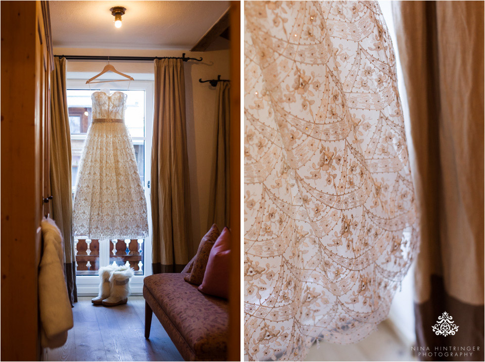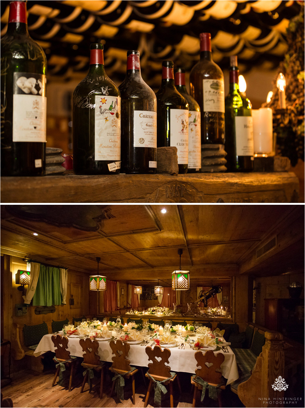 One year ago we met Tracey and Kelly from Texas for the first time in person and had a wonderful afternoon together while taking their engagement photos. Short ago it was time for their wonderful winter wedding in St. Anton and St. Christoph at the Arlberg. They chose to get married between Christmas and New Year and so lots of their families and friends from all over the United States made it happen to come to Austria for this special occasion. They combined it with a winter and skiing vacation, really perfect. The day before the wedding we had the great opportunity to meet some of their guests already in person as we had a whole shooting day to create some wonderful snowy memories for them - find some images in our previous blog post. On their wedding day we had MINUS 18 degrees celsius but Kelly and his friend Billy are really tough guys because they skied down the slopes near the wedding chapel just before the ceremony - they were not even wearing gloves, a cap or an additional jacket - OMG! Tracey had a wonderful hand made dress by Francesca Miranda, Columbia - South America, really stunning! We loved all the personal details Tracey and Kelly added to their wedding, for example their extraordinary place cards. They are having horses at home and they have similar name plates - such a great idea to bring some Texan flair to this Austrian winter wedding. Can you imagine carrying all this stuff by plane and train from Texas to Austria? Respect! Tracey and Kelly are members of the Bruderschaft St. Christoph and decided to celebrate the wedding in their nice and cosy chapel. Afterwards they had a Glühwein-reception at the Arlberg Hospiz Hotel and then they had dinner and partied all night long at the Arlberg Hospiz Alm. Of course they also visited the impressive wine cellar with their guests and enjoyed one of the really, really big wine bottles.