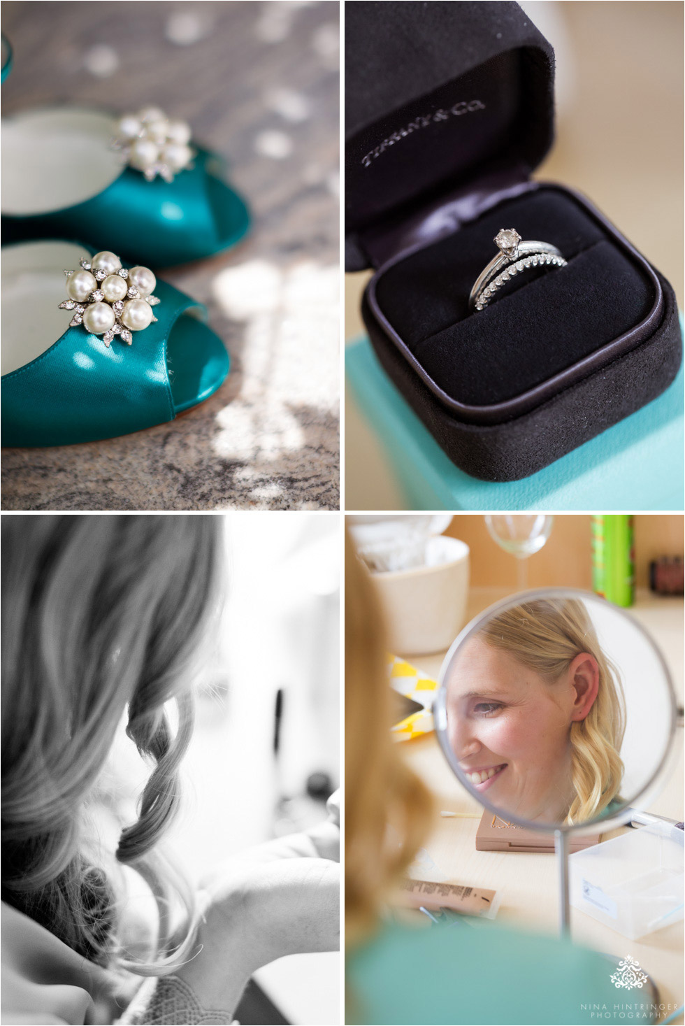Cat and Menno created a gorgeous look and feel, they successfully incorporated the ski-theme into almost anything. Not just snow flakes, skis and a bobsleigh as decoration parts, also little skis for the groom as boutonniere, the bridesmaids` dirndls, the ties and cufflinks as well as the bride`s shoes and lots of other wonderful details in perfect matching colors! So Cats favorite color `Tiffany Blue` was carefully integrated throughout the whole wedding. Additionally it was no surprise that Cat and Menno even brought their skis to incorporate their theme also in their portraits. Apropos skis: they had such a great idea of creating an extraordinary guest book - they had an old pair of skis to sign for their guests - that`s just amazing and so you have a great piece of art for your home afterwards!
