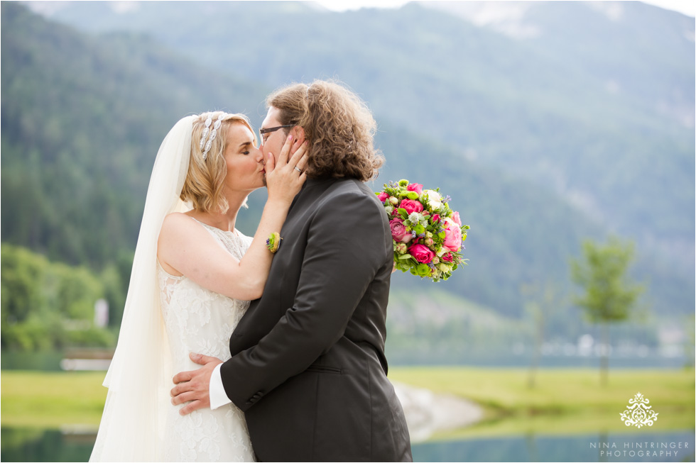 To sum it up: A magical day! Monika and Patrick are made for each other and we had the wonderful opportunity to document their wedding at the Achensee! Just a view weeks ago we had the chance to do an engagement shoot with them in Innsbruck, it was super fun and we hardly could wait to photograph their wedding as well. We kicked off the wedding day with the getting ready part at the stunning Hotel Kronthaler****s in Achenkirch, the ambience there is just wonderful and made for relaxation. Monika had an amazing Pronovias dress, it was just perfect for her and also the groom's suit was absolutely extraordinary. All the flower arangements were created by the talented team of Atelier Rosengarten, one of our favorite florists ever. First the weather played along quite well and we could finish the bridal portraits outside, just at the end of our session it started raining cats and dogs and did not want to stop. If you know the Annakircherl in Achenkirch you know that all the guests have to walk up there and they were all brave and almost no one came up dry. But that could not even break the mood, Monika and Patrick had a lovely ceremony and right afterwards it stopped raining and cleared up a bit so all the guests could congratulate the newlyweds outside. The reception and dinner took place at the Seealm, a cozy location with a perfect team. The bridal couple created homemade fortune cookies for all the guests as a gift and they all contained a personal note for each guest. Phil and I also received such a delicious cookie and were amazed that we found a personal note in there with our name at the beginning. The whole day the band Good Vibrations was getting the vibe going. As music is something really special for the bridal couple they received a lovely surprise: their nephew, aged five, played the violin for them, how cute is that! Fireworks summed up the day just perfectly and highlighted the sky.