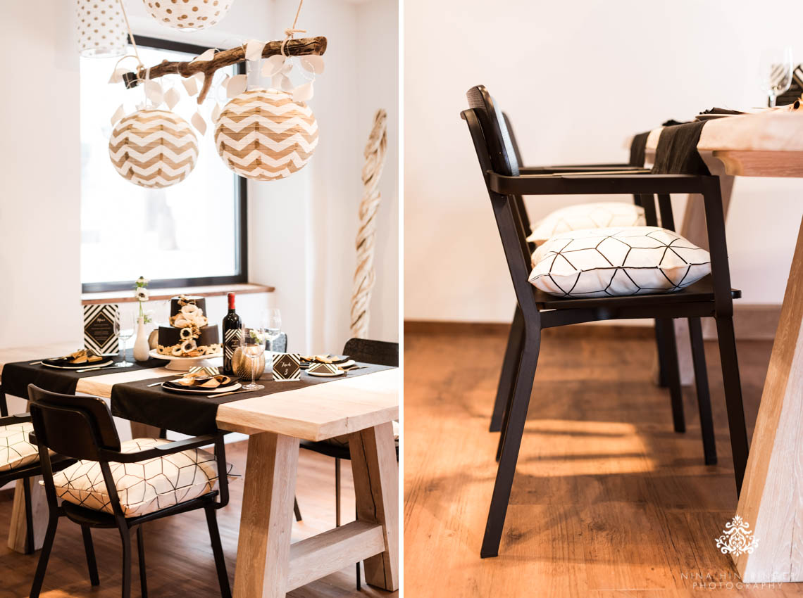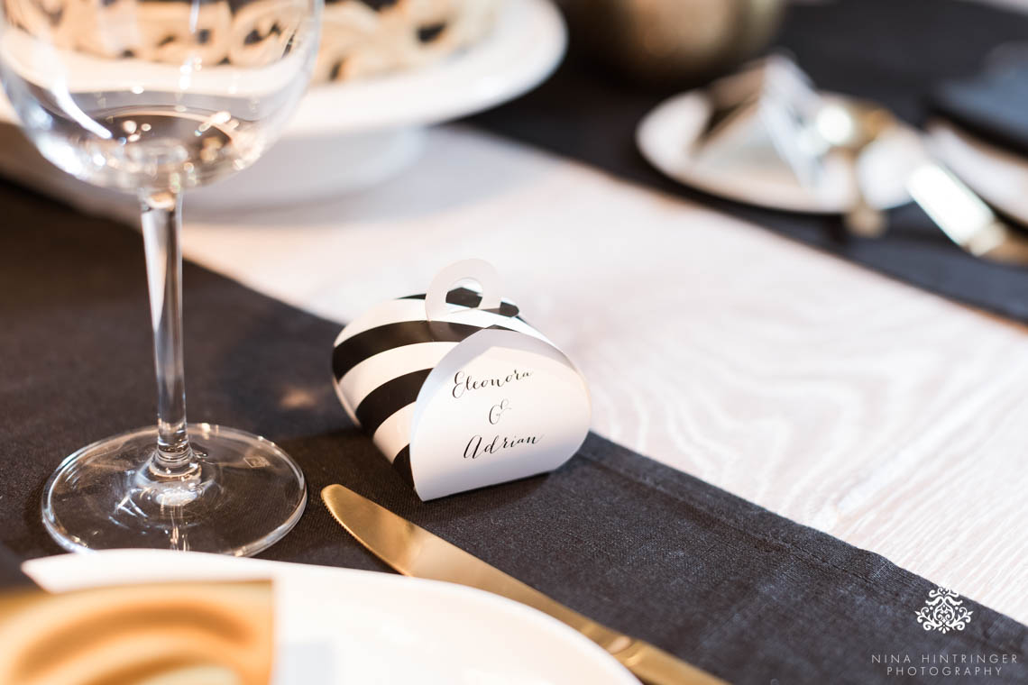 Petra has a one-of-a-kind interior and lifestyle store in our home town Schwaz in Tyrol and there you can find everything your heart beats for. Really extraordinary things, excellent design and warm-hearted staff. Always worth a visit, but be prepared that you will buy a bit more than you thought beforehand as you can find so many beautiful things there. Petra created such a wonderful decoration for our shoot and supported us with outstanding tableware in black and white. She was on board right away as I talked to her about our wedding stationery and inspirational shoot idea to make this gold, black and white dream come true. She even ordered golden cutlery to make the table decoration perfect. Viola is part of the süss und blumig team and they create wonderful flower anrrangements and cakes for every occasion.